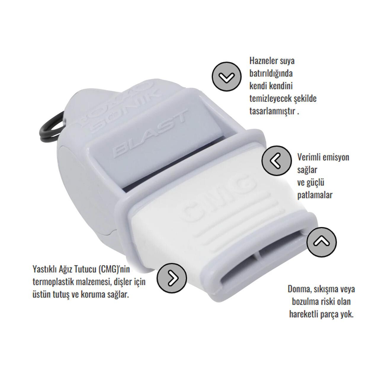 Fox 40 9203 Sonik Blast Safety CMG İpli Düdük Beyaz, yüksek ses gücü ve profesyonel kullanım odaklı yapısıyla güvenlik, spor ve acil durumlar için tasarlanmış güçlü bir düdüktür. Sonik Blast teknolojisi sayesinde tek üflemede son derece net, patlayıcı ve uzak mesafeden duyulabilen bir ses üretir. Hareketli parça içermeyen yapısı; donma, sıkışma ya da arıza riskini ortadan kaldırarak her ortamda güvenilir performans sunar. Suya batırıldığında kendi kendini temizleyen hazneleri, özellikle açık alan ve su sporlarında büyük avantaj sağlar.