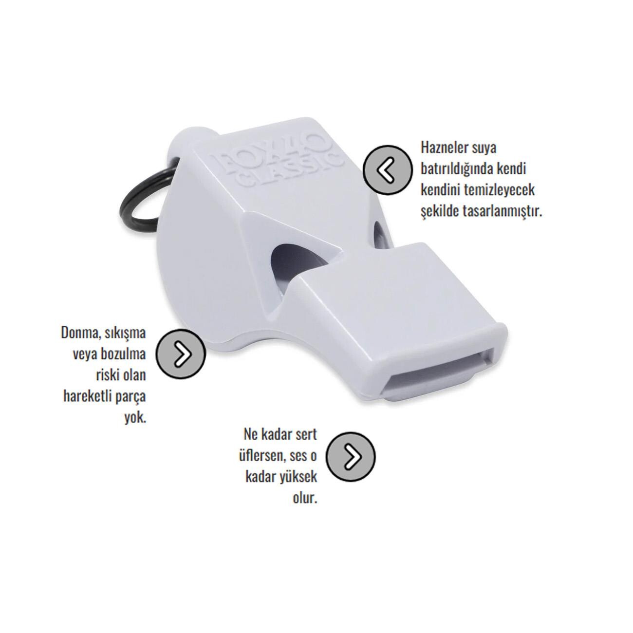 Üfleme şiddetine bağlı olarak ses seviyesini artırabilen Fox 40 9902, gürültülü ve rüzgârlı ortamlarda bile net şekilde duyulan güçlü bir ses üretir. Suya batırıldığında kendi kendini temizleyebilen yapısı sayesinde deniz sporları, yüzme aktiviteleri ve cankurtaran kullanımı için de uygundur. Dayanıklı ve hafif plastik gövdesi, uzun süreli kullanımlarda konfor sağlarken darbelere karşı direnç gösterir. Düdükler kategorisinde performans, dayanıklılık ve güvenilirliği bir arada sunan bu model, Fox 40 kalitesini pratik bir tasarımla buluşturur.