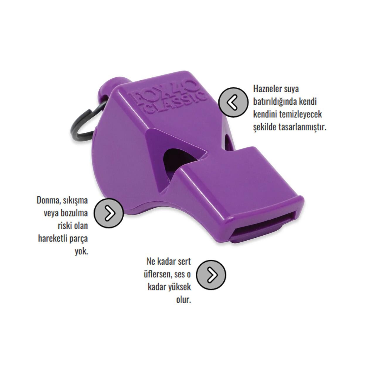 Gelince Haber VerFox 40 9902 Classic Safety Düdük Mor, güçlü ses çıkışı ve arızasız yapısıyla spor, güvenlik ve acil durum kullanımları için tasarlanmış profesyonel bir düdüktür. Fox 40 Classic serisinin en bilinen modellerinden biri olan bu ürün, hareketli parça içermeyen özel tasarımı sayesinde donma, sıkışma veya bozulma riski olmadan her koşulda güvenilir performans sunar. Mor rengi, klasik düdüklerden farklılaşarak hem görünürlük hem de kişisel stil açısından dikkat çekici bir alternatif oluşturur.